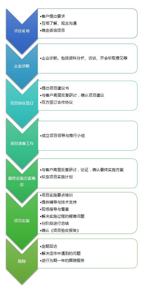 明睿公司根據(jù)10多年來(lái)為企業(yè)提供項(xiàng)目咨詢服務(wù)的經(jīng)驗(yàn)制定了一套成熟的項(xiàng)目咨詢的操作流程體系,我們大致將流程分為:項(xiàng)目前期、企業(yè)診斷、協(xié)議簽訂、準(zhǔn)備工作、確定方案、項(xiàng)目實(shí)施,跟蹤服務(wù)這幾個(gè)大部分,具體請(qǐng)看下圖: